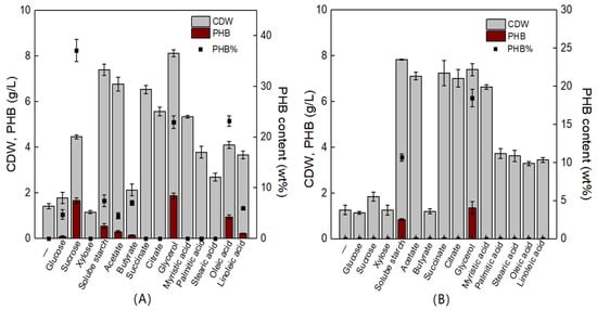 CDW, PHB concentration, and PHB content profiles of V. alginolyticus LHF01 (A) and LHF02 (B) cultivated in TYS medium with different carbon sources. Data are expressed as averages and standard deviations of three parallel experiments.