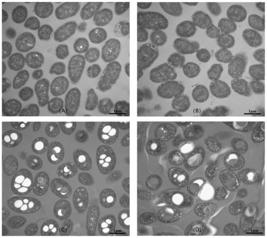 The cells of V. alginolyticus LHF01 and LHF02 grown on TYS medium and TYS supplemented with glycerol were observed by transmission electron microscopy. As shown in Figure 4, the average cell size of V. alginolyticus cultured in TYS medium was found to be 0.8–1.8 μm. With the addition of 20 g/L glycerol, it was observed that the volume of the cells increased significantly, and the cells contained electron-translucent inclusions of different sizes. The TEM observation results were consistent with previous studies, in which the intracellular accumulation of PHA polymer resulted in visible particles [13].