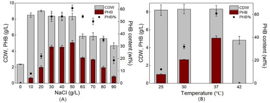 CDW, PHB concentration, and PHB content profiles of V. alginolyticus LHF01 cultivated in TYS medium supplemented with 20 g/L glycerol at different NaCl concentrations (A) and temperatures (B). Data are expressed as averages and standard deviations of three parallel experiments.