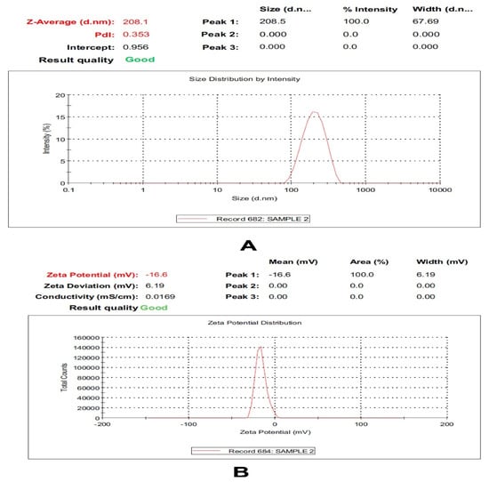 The average particle size (PS) and size distribution expressed as the polydispersity index (PDI) were estimated by dynamic light scattering (DLS) at 25 °C using a Zetasizer Nano ZS (Malvern Instruments, Malvern, UK) [32,33]. The zeta potential (ZP) was determined by the same instrument [34,35]. Prior to performing the determinations, all dispersions were appropriately diluted (100 times) using distilled water. Triplicate measurements were always obtained for each determined response [36,37].