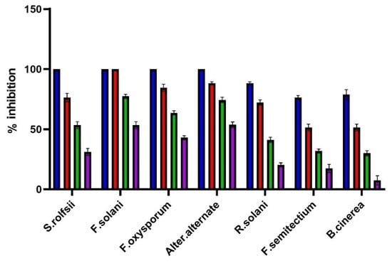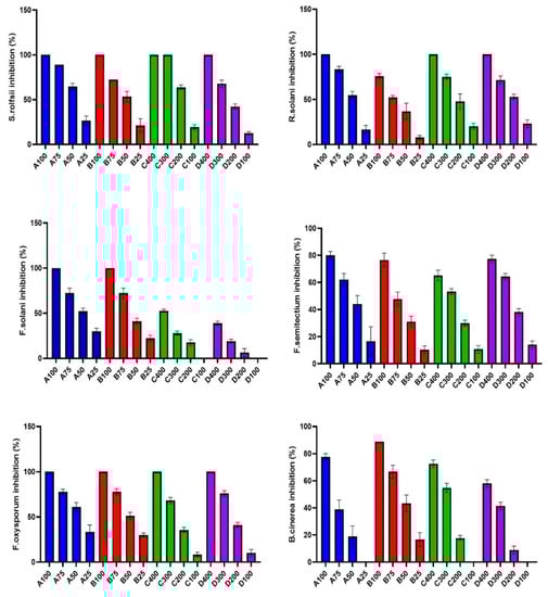 The fungal growth inhibition was calculated according to the treatment against the control using the following formula [40]: