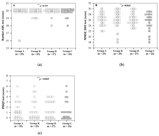Numbers of subjects in groups A, B, D and C for Barthel ADL (a), MMSE Thai 2002 (b) and PHQ9 (c) tests before the study. Non-anemic elders consumed the WR drink (2 mg iron/100 mL serving) (group A), IR drink (15 mg iron/100 mL serving) (group B) and IR drink (27 mg iron/100 mL serving) (group D), while anemic elders consumed the IR drink (15 mg iron/100 mL serving) (Group C) for 30 days. Data of individual subjects are expressed accordingly. ** Fisher’s exact test when members of the same group were compared. Abbreviations: ADL = activities of daily living, MMSE = Mini Mental State Examination, PHQ9 = Patient Health Questionnaire 9.