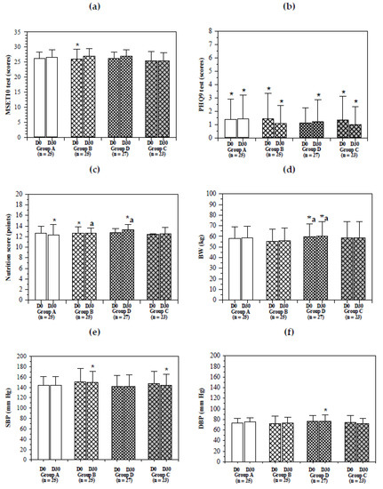 BW, SBP/DBP and pulse rate were recorded on days 0 and 30. The MMSE Thai 2002 and PHQ9 tests (Thai-version) were used to assess whether there were any issues of cognitive ability and/or depression on days 0 and 30 (±1 or 2), respectively [68,69,70]. Next, a questionnaire on the nutritional background of each subject was used to complete a nutritional assessment. Lastly, Barthel’s index was used to evaluate the activities of daily life for each subject.