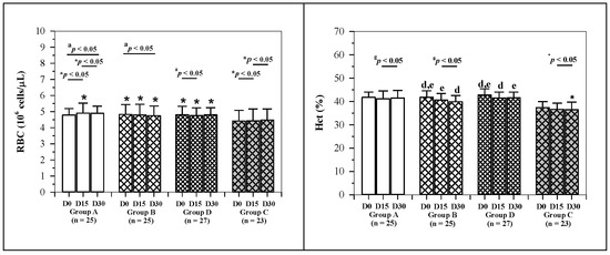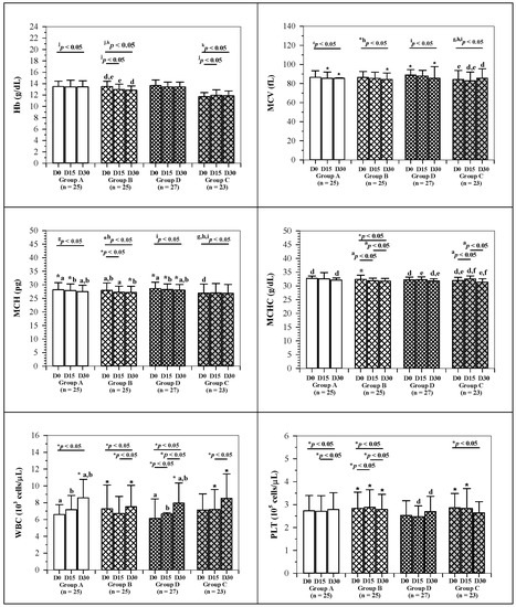 Changes in RBC indices, WBC and platelet numbers of elderly subjects. Non-anemic subjects consumed the WR drink (2 mg iron/100 mL serving) (group A), IR drink (15 mg iron/100 mL serving) (group B) and IR drink (27 mg iron/100 mL serving) (groups D), and anemic subjects consumed the IR drink (15 mg iron/serving) (group C) for 30 days and blood samples were collected for complete blood count analysis. Data are expressed as mean ± SD values. * Comparisons of results of Shapiro–Wilk test (p < 0.05). d,e,f Between D0 and D15, D0 and D30, D15 and D30 for normal distribution by paired Student’s t-test (p < 0.05) after using repeated analysis of variance (repeated ANOVA) (p < 0.05). a,b,c Comparisons between D0 and D15, D0 and D30 and D15 and D30 for non-normal distribution were performed by the Wilcoxon signed rank test (p < 0.05) after using the Friedman test (p < 0.05). j,k,l Bonferroni test (p < 0.05) among groups with normal distribution data after using one-way analysis of variance (one-way ANOVA) test. g,h,i Comparisons of Kruskal–Wallis test (p < 0.05) for four groups and Dunn test (p < 0.05) between two groups with non-normal distribution data. Abbreviations: EOS = eosinophil, Hb = hemoglobin, Hct = hematocrit, Lym = lymphocyte, MCH = mean corpuscular hemoglobin, MCHC = mean corpuscular hemoglobin, MCV = mean corpuscular volume, Mon = monocytes, PLT = platelet, PMN = polymorphonuclear cell, RBC = red blood cells, WBC = white blood cells.