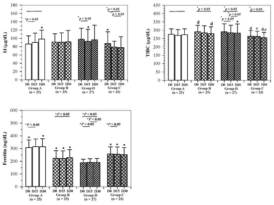 Changes in levels of serum iron, total iron-binding capacity and ferritin of elderly subjects. Non-anemic elders consumed the WR drink (2 mg iron/100 mL serving) (group A), IR drink (15 mg iron/serving) (group B) and IR drink (27 mg iron/100 mL serving) (group D), and anemic elders consumed the IR drink (15 mg iron/100 mL serving) (group C) for 30 days and blood samples were collected for analysis of iron parameters. Data are expressed as mean ± SD values with the exception of ferritin, which is expressed as mean ± SEM values. * Shapiro–Wilk test (p < 0.05). d,e,f Comparisons between D0 and D15, D0 and D30, D15 and D30 for normal distribution by paired Student’s t-test (p < 0.05) after using repeated measure ANOVA (p < 0.05). Abbreviations: Ft = ferritin, SI = serum iron, TIBC = total iron-binding capacity.