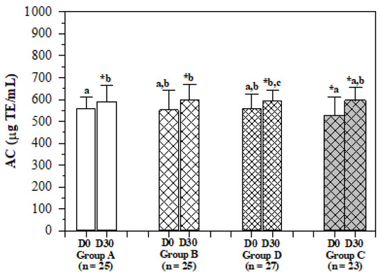 Changes in levels of serum antioxidant capacity of elderly subjects. Non-anemic elders consumed the WR drink (2 mg iron/100 mL serving) (group A), IR drink (15 mg iron/100 mL serving) (group B) and IR drink (27 mg iron/100 mL serving) (group D), while anemic elders consumed the IR drink (15 mg iron/100 mL serving) (group C) for 30 days and blood samples were collected for analysis of antioxidant capacity. Data are expressed as mean ± SD values with the exception of ferritin, which is expressed as mean + standard error of the mean (SEM). * Shapiro–Wilk test (p < 0.05). a,b,c Comparisons between D0 and D30 for non-normal distribution by Wilcoxon signed rank test (p < 0.05) after applying the Friedman test (p < 0.05). Abbreviations: AC = antioxidant capacity, TE = Trolox equivalent.