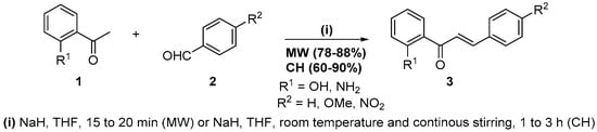 The aldol condensation is one of the most valuable strategies to form carbon-carbon bonds, apparently was first introduced in 1872 by Charles Wurtz, and consists of the condensation of two carbonyl compounds (ketones or aldehyde) in the presence of an acid or a base as a catalyst [12,13]. This condensation is of particular application in the synthesis of chalcones, recognized bioactive flavonoids [14] and important precursors of chromones and quinolones. Our experience in their synthesis [15,16] indicates that the best results are obtained with base catalysis and usually a long reaction time (3 h to 20 h). Therefore, aiming to shorten the reaction time, we tested the aldol condensation of 2′-hydroxyacetophenones 1 with benzaldehydes 2 under microwave irradiation (Scheme 1) [17].