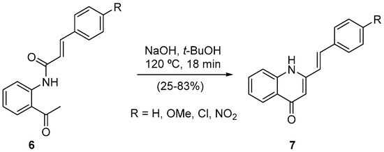 A similar procedure was used to shorten the reaction time of the (E)-2-styrylquinolin-4(1H)-ones 7 synthesis through a one-pot process involving the cinnamoyl transposition and cyclization (Scheme 3) [24]. We achieved the desired reduced reaction time, and the developed methodology, under microwave irradiation, which had two extra positive effects: the use of a less dangerous base and the possibility to obtain, although in lower yield (25%), the (E)-2-(4-nitrostyryl)quinolin-4(1H)-one, which is not obtained in classical heating conditions [24].