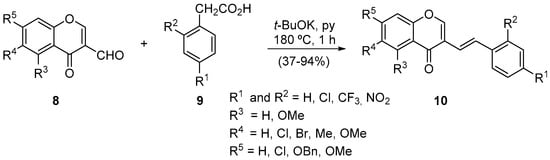 Knoevenagel condensation, a reaction named after being established by the German chemist Emil Knoevenagel [25,26,27], is commonly used in organic synthesis and is of particular utility in total synthesis [28]. In our case, we applied this type of reaction to obtain chromone derivatives, in particular (E)-3-styryl-4H-chromen-4-ones 10 [29]. The methodology consists of the Knoevenagel condensation between the 4H-chromen-4-one-3-carbaldehyde 8 with arylacetic acids 9, followed by an in situ decarboxylation (Scheme 4).