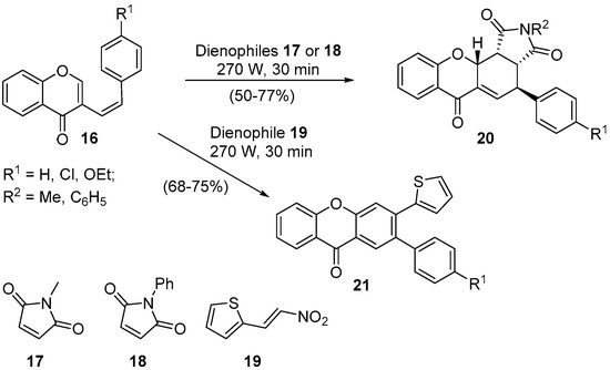 The first point to be mentioned is the fact that the DA reaction of electron-deficient dienophiles N-methylmaleimide 17, N-phenylmaleimide 18, and 2-(2-nitrovinyl)thiophene 19 with (Z)-3-styryl-4H-chromen-4-ones 16 produces the respective cycloadducts in very good yields, in solventless conditions, and in 30-min reaction time (Scheme 6) [45,47]. It should also be highlighted that in the reaction with 2-(2-nitrovinyl)thiophene 19, the DA adduct undergoes in situ HNO2 elimination and oxidation, giving 2-aryl-3-(thiophen-2-yl)-9H-xanthen-9-ones 21 regioselectively towards the depicted isomer 20 (Scheme 6).