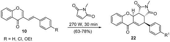 (Z)-3-Styryl-4H-chromen-4-ones 16, readily available through a Wittig reaction between 4H-chromen-4-one-3-carboxaldehydes and benzylidenetriphenylphosphoranes [46], proved to be a low-reactive diene under classical heating conditions, even when a very reactive dienophile, such as N-methylmaleimide, was employed [47]. Mixtures of compounds were obtained and the desired adduct, 4-aryl-2-methyl-3a,4,11a,11b-tetrahydrochromeno[2,3-e]isoindole-1,3,6(2H)-trione, was obtained in yields below 50%. Aiming to establish a more efficient synthetic procedure, we started our interest in the use of MW irradiation to improve the (Z)-3-styryl-4H-chromen-4-ones 16 reactivity in the DA reactions (Scheme 6) [45,47].