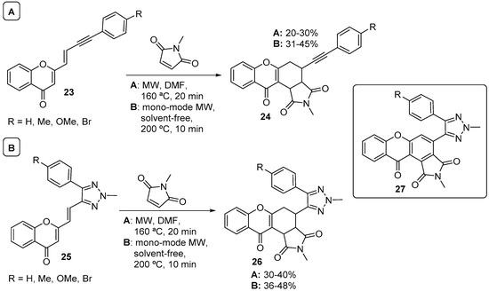 Following these earlier studies in DA reactions with (E)- and (Z)-3-styryl-4H-chromen-4-ones as dienes, years later, we also explored the reactivity of particular chromone derivatives 23 and 25 to develop a method for the synthesis of 9H-xanthen-9-one-1,2,3-triazole hybrids 27 (Scheme 8) [48]. The diene of chromones 23 showed very low reactivity in classical heating conditions using maleimides as dienophiles. Fortunately, when multimode MW irradiation was applied, cycloadducts 24 were obtained in 20–30% yield in 20-min reaction time (Scheme 8A). Using a monomode microwave apparatus, we further improved the reaction yield to 31–45%, shortening the reaction time from 20 min to 10 min and avoiding the use of solvents (Scheme 8). The same principle was applied to chromone derivatives 25 (1,2,3-triazole replacing the internal alkyne of chromones 23), and again the best yields of cycloadducts 26 (36–48%) were achieved after 10 min of monomode MW irradiation, in solvent-free conditions (Scheme 8B).