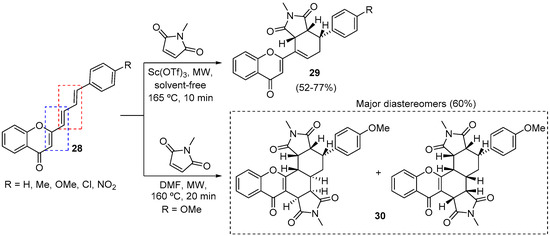 Following these studies, we decided to replace the internal alkyne of chromones 23 for an additional double bond to came up with 4H-chromen-4-one compounds with two dienes 28 (Scheme 9) [49]. This particular type of compound has two possible DA reaction sites, the reactivity of which was further explored using MW irradiation. If Sc(OTf)3 is used as Lewis acid in the solvent-free DA reaction of 4H-chromen-4-ones 28 with N-methylmaleimide, monoadducts 29 are obtained in 52–77% yield (Scheme 9). On the other hand, in the absence of this Lewis acid, it was possible to drive the DA reaction towards the bisadduct 30 in 60% yield, obtained as a mixture of two diastereomers (Scheme 9).