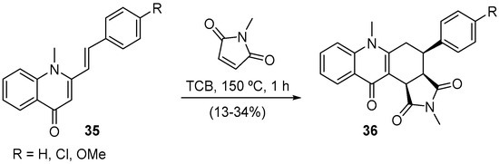 Given the Diels–Alder reaction using 3-styryl-4H-chromen-4-ones 10 and 16 as dienes success, we tested less reactive derivatives, the (E)-1-methyl-2-styrylquinolin-4(1H)-ones 35 in the same transformation (Scheme 11) [50]. The microwave irradiation effect was mostly observed in shortening the reaction time (from 72 h to 1 h) and restraining the formation of other products. Interesting is the fact that the expected cycloadduct, the 4-aryl-2,6-dimethyl-4,6,11a,11b-tetrahydro-1H-pyrrolo[3,4-a]acridine-1,3,11(2H,3aH)-triones, underwent in situ a 1,3-hydrogen shift, that is, the proton H-11a was shifted to carbon C-5, giving the final product 36 (Scheme 11) [50].