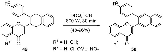 Oxidative aromatization can be an important step in synthesizing new heterocyclic compounds and usually requires a long reaction time and more than one step. For example, the dehydrogenation of 2-(3-aryl-1,2,3,4-tetrahydronaphthalen-2-yl)-4H-chromen-4-ones 49 could be performed in a two-step procedure for 17 h, which involves the use of N-bromosuccinimide (NBS) [64]. Moreover, the treatment of the same 4H-chromen-4-ones 49 with 2,3-dichloro-5,6-dicyano-1,4-benzoquinone (DDQ) in classical thermal reflux conditions afforded some of the desired 2-(3-arylnaphthalen-2-yl)-4H-chromen-4-ones 50 in good yields but requires 24 h of 1,2,4-trichlorobenzene (TCB) reflux under nitrogen atmosphere [62]. The microwave irradiation assisted the aromatization, even of the 2-(3-aryl-1,2,3,4-tetrahydronaphthalen-2-yl)-4H-chromen-4-onse 49-bearing electron-withdrawing groups, in better yields and in only 30-min reaction time (Scheme 17) [62]. In this example, it is evident that the microwave effect is shortening the reaction time and the accomplishment of the desired transformation for both electron-withdrawing and -donating groups.