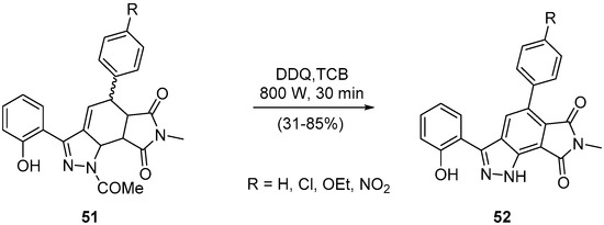 Another interesting DDQ-mediated aromatization using microwave irradiation is the synthesis of 5-aryl-3-(2-hydroxyphenyl)-7-methylpyrrolo[3,4-g]indazole-6,8(1H,7H)-diones 52 through the oxidation of 1-acetyl-5-aryl-3-(2-hydroxyphenyl)-7-methyl-5,5a,8a,8b-tetrahydropyrrolo[3,4-g]indazole-6,8(1H,7H)-diones 51, with N-deacylation (Scheme 18) [53].