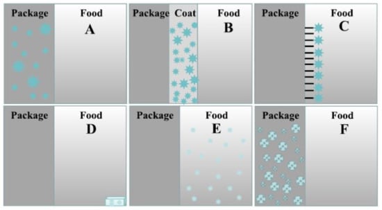 Schematic representation of various methods for incorporation of essential oils into packaging materials: (A) direct addition into packaging material; (B) incorporation into coatings; (C) immobilization onto substrates; (D) entrapment into physical carriers; (E) addition into headspace; (F) incorporation into matrices through carriers. Reprinted with permission from [17]; Copyright 2021 Elsevier.