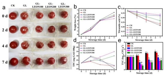 Visual pictures (a); changes of weight loss (b), titratable acid (c), total phenolic content (d) and total viable microbial counts (e) of cherry tomatoes wrapped by gelatin-lavender essential oil (GL-LEONs) films during storage at 25 ± 2 °C. Different letters at the same storage time (e) indicate significant difference. Adapted from [85]; Copyright 2021 Elsevier.