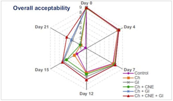 Changes in overall acceptability (based on appearance, odor, and texture) of beef loins treated with chitosan (Ch), cumin essential oil nano-emulsion (CNE), and gamma irradiation (GI) during chilled storage. Adapted from [94]; Copyright 2021 Elsevier.