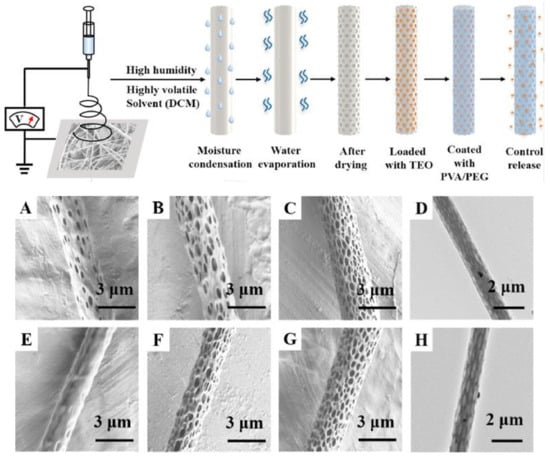 Besides controlling the viscosity and surface tension of the solution, and the morphology of polymeric macromolecular chains, solvents and their volatility also have an important role in the porosity of electrospun fibers. Phase separation phenomena can be induced using mixtures of solvents with different boiling points or solvent/non-solvent systems, leading to various pore structures through electrospinning [133,134]. Bioactive components can be loaded into the porous structure of the nanofibers for protection and controlled release. A schematic representation of pore formation on the electrospun fibers followed by loading with bioactive principle and coating with PVA/poly(ethylene glycol) (PVA/PEG) for controlled release, and the SEM images of porous nanofibers, is presented in Figure 4. The overall porosity of the electrospun mat, shown by the empty spaces between fibers, is strongly affected by the collector geometry, which determines the distribution of the electrical field in which the threads fly from the region of whipping instability at the needle, orienting and aligning the fibers [135]. Solidification of polymers by solvent evaporation occurs very fast during electrospinning, decreasing the glass transition of the material [136].