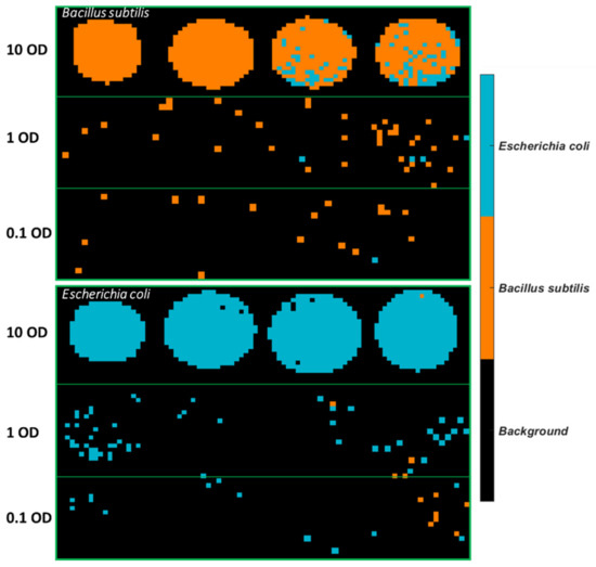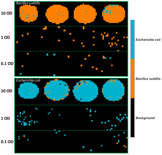 Classification maps of all images were generated using the SVM model built from 3500–2600 cm−1, as can be seen in Figure 5. It is observed that plenty of pixels of B. subtilis at 10 OD are incorrectly classified as E. coli, which explains the low sensitivity (0.82) in Table 5. As for E. coli samples, most misclassified pixels are found at 1 OD and 0.1 OD.