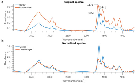 To further investigate this result, the mean spectra of the misclassified outside layer and the correctly classified centre part of E. coli at 10 OD were obtained and are plotted in Figure 8a. The spectrum of the outside layer demonstrates higher absorption across the entire spectral region, which is direct evidence of highly concentrated biomolecules in the edge ring. It is also observed that a shoulder at 1641 cm−1 emerges from the spectrum of the outside layer (as marked in the vertical dashed line of Figure 8a). The sharp absorption band at 1655 cm−1 originates from the amide I of -helical structure, while the band found located at 1637 cm−1 is assigned to the amide I of -sheets [9]. Therefore, this result is indicative of different protein structures due to the coffee ring effect. Normalized spectra, obtained by dividing the intensity at 2926 cm−1, are also obtained and exhibited in Figure 8b. A surprisingly higher proportion of amide groups are evidenced in the central part. On the contrary, the outside layer shows a higher ratio of fatty acids represented by the spectral features in the range of 3000 cm−1 to 2800 cm−1. Eales and Routh [22] studied the shape resulting after evaporation of the inkjetted droplets of a solvent containing a light-emitting polymer, and they reported that polymers with larger molecular weight mitigated the coffee ring effect because their large weight counteracted transport by the weak capillary flow. In the present study, a lesser amount of protein might transport to the edge due to its larger molecular weight compared to fatty acids, leading to more concentrated fatty acids on the outside layer but more proteins inside.