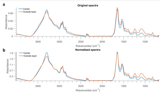 Mean spectra of the centre part and outside layer of one E. coli sample at 10 OD from Al (after removing baseline using asymmetric least squares smoothing) (a), as well as the result after normalization by dividing the intensity at 2926 cm−1 (b).