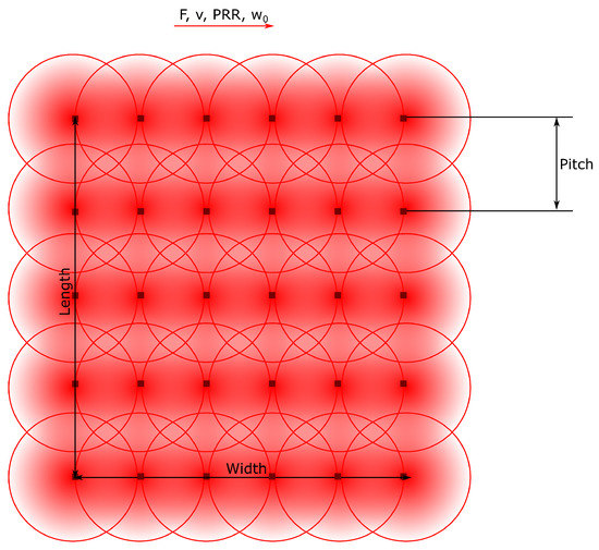 This approach was used to determine the maximum temperature reached per point on a treated surface produced by hatching parallel laser lines distanced by a certain pitch with a determined speed and repetition rate, as illustrated in Figure 1. We considered that heat propagates from the surface to the infinitely deep bulk of the solid, equally in all directions . To these lines, we added the time delays corresponding to the acceleration and deceleration ramp times at the end and beginning of each line, respectively. This is the typical behavior of a beam moved in relation to the specimen when a galvo scanner or mechanical stages are used.