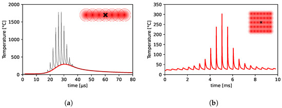 The plot in Figure 2a shows the temperature distribution, using the first approach described above in Section 3.1, at the center of a 100 long lased line on stainless steel, using 2 J/cm2 peak fluence, 1 m/s scanning speed at 500 kHz repetition rate and 28% residual heat. The plot shows that the material cannot cool down in between pulses, resulting in an accumulation of heat in the ablation surface. If the accumulated temperature before the subsequent pulse, corresponding to the local minima in the plot represented by the red dashed line, exceeds a critical or modification temperature of the material, thermal damage will take place [23,29]. The maximum of these local minima is thus often interpreted as the maximum temperature reached by the ablation surface. The plot in Figure 2b shows the temperature distribution at the center of an ablated square of 100 m × 100 m, using the same laser parameters as in the point described by Figure 2a, with 5 pitch and considering 400 acceleration plus deceleration delays at the end of each scanned line. In this figure, only the local minima, or the time points at which each pulse heats up the surface (analogous to the red dashed line in Figure 2a), are plotted for an easier lecture of the data. These results illustrate the influence of the processing delays and neighboring ablated lines in the accumulated heat at each surface point. Different maximum temperatures are expected should the area dimensions vary.
