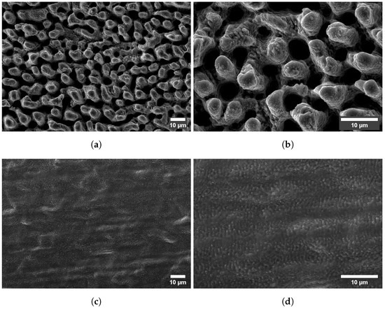 2500× magnification. (c) 15.8 J/cm2, 2.2m/s, 1000× magnification. (d) 15.8 J/cm2, 2.2m/s, 2500×