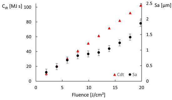 These results show that, for these ranges of speeds and fluences, combining high fluence with low scanning speed results in the accumulation of heat by the ablation surface, leading to visible thermal degradation. Regarding the corresponding simulated temperatures, they increase with increasing fluence and decreasing scanning speed as expected, but a single of threshold modification temperature above which thermal damage is observed cannot be determined. If we compare solely the results of a single line (constant speed, increasing fluence) or column (constant fluence, increasing speed) of one of the matrices, we verify that above a certain fluence or below a certain speed, the ablation surface is thermally affected. However, the simulated temperature at which such modification takes place is not systematic or independent of the parameters. For example, in the first matrix (Figure 3), the treated area is damaged for J/cm2 and m/s and undamaged when using J/cm2 and 1 m/s, but the estimated temperatures are 194 and 185 , respectively, so quite comparable, contrarily, to the obtained morphologies. Additionally, the treatments performed at high fluences and high scanning speeds yield surfaces free of thermal damage, as can be seen in the matrix depicted in Figure 4a or the micrographs in Figure 5c,d, for which the simulated maximum temperature was 1321 . The maximum temperature obtained for the conditions at which the area depicted in Figure 5a,b was 576 , which is lower than the heat modification temperature threshold indicated by Bauer et al. [23], though the macro- and micrographs show a rough and porous surface with a coral structure, described in the literature as an effect of heat accumulation [5,30]. The graph in Figure 6 plots the values of the surface roughness of the treated specimens as well as the corresponding values of for areas produced on stainless steel with m/s scanning speed, 14 spot diameter at 500 kHz (corresponding to the forth line of areas depicted in the matrix in Figure 4). The lower slope of above 10 J/cm2 may indicate that the surface was partially molten upon the laser treatment [31]. Still, these results show the proportionality of the two parameters, and , and validate the first one. Regarding the heat values calculated, using the approach described in Section 3.2, the results demonstrate that, for this range of processing parameters, the results correlate with the experimental ones for both matrices, at fluences above ≈, and the value of 200 can be used as criteria to predict thermal damage, even for fluences above 10 J/cm2. For fluences lower than about J/cm2, this heat threshold of 200 above which we expect thermal damage is underestimated. If this threshold is rather 2000 , the correlation between the calculation and the experimental results improves. This can be explained by the existence of two different ablation regimes. For the regime prevailing at low fluences, the ablation depth is determined by the optical penetration depth of the material. On the other hand, at high fluences, the energy transport is dominated by the electronic heat diffusion during the laser pulse, which is too low for low fluences, but increases at higher electron temperatures reached at high laser fluences [32,33,34,35]. This is why we applied the two different heat damage thresholds, or colors: to better interpret the calculated heat values listed in Figure 3c.