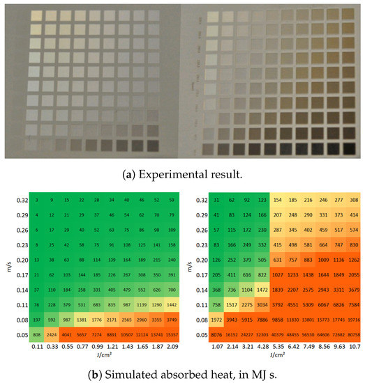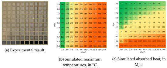 Figure 3a presents a matrix of ablated areas produced on stainless steel 316L, using peak fluences in the range between 0.4 J/cm and 4 J/cm and scanning speeds varying from 0.1 m/s to 1 m/s at 500 kHz pulse repetition rate, 14 spot diameter at focus, 5 pitch and 5 layers. Figure 4a presents a matrix of ablated areas produced on the same metal, using peak fluences in the range between 2 J/cm and 19.8 J/cm and scanning speeds varying from 0.1 m/s to 2.2 m/s at the same repetition rate as the matrix depicted in Figure 3a, as well as the same spot diameter, pitch and 50 of layers. Figure 3b and Figure 4b show the corresponding simulated maximum temperatures reached, considering 28% residual heat, with the colors green-yellow-orange associated with low to high temperatures to facilitate the analysis of the table. In turn, Figure 3c and Figure 4c list the corresponding estimated absorbed heat values , in green-yellow-orange colors, in which the areas are yellow for , orange if and green for lower values, for fluences higher than J/cm2. For lower fluences, the areas are yellow for , orange if and green otherwise.