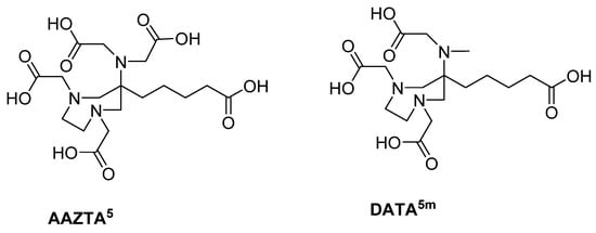 The chelator is responsible for the introduction of the radionuclide. In this study, the bifunctional hybrid chelators DATA5m (6-pentanoic acid-6-aminoperhydro-1,4-diazapine-triacetate) and AAZTA5 (6-pentanoic acid-6-aminoperhydro-1,4-diazepine tetra-acetic acid) are used (Figure 1). With regard to radiometals, hybrid chelators combine the positive complexation properties of acyclic chelators, such as fast complexation kinetics at mild temperatures, with the advantages of cyclic chelators, such as prolonged complex stability [16,17]. In these structures, the two tertiary diazepine amines provide the cyclic component for complexation. Another amine outside the perhydro-1,4-diazepine backbone provides another complexation unit (acyclic component). The remaining complexation sites are provided by carboxy groups alkylated to the amines [16,18,19,20].