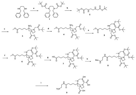 Synthesis of DATA5m: (a) tert-butyl bromoacetate, Na2CO3, MeCN, 96%; (b) Pd/C, EtOH, formic acid, H2, 98%; (c) paraformaldehyde, 2-nitrocyclohexanone, MeOH, 77%; (d) Raney®-Nickel, EtOH, H2, 72%; (e) tert-butyl bromoacetate, DIPEA, MeCN, 62%; (f) Formalin (37%), AcOH, NaBH4, ACN, 74%; (g) LiOH, dioxane/H2O, 84%; (h) tertbutyl(2aminoethyl)carbamate, HATU, DIPEA, ACN, 94%; (i) TFA/DCM, 1:1.