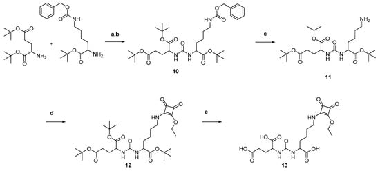 For the introduction of the urea unit, the amino group of the protected lysine was transformed into an isocyanate using triphosgene. The isocyanate was then reacted with tert-butyl protected glutamate and the protected PSMA inhibitor lysine-urea-glutamate 10 was obtained and followed by reductive deportation of the lysine side chain, yielding 11. This compound was then coupled to SADE in phosphate buffer at pH 7. Acidic deprotection of the protected compound 12 led to the couplable PSMA inhibitor lysine-urea-glutamate-squaric acid monoester 13 (KuE.SAME).