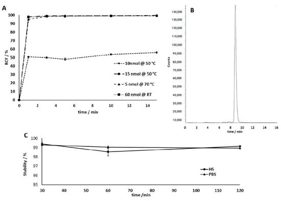 DATA5m.SA.KuE was radiolabeled with gallium-68 in ammonium acetate buffer (1 M, pH 5.5), varying amounts of precursor (5 nmol to 60 nmol), and different temperatures (room temperature to 70 °C). Labeling was carried out in triplicate with 30–50 MBq of gallium-68. Figure 6A shows the kinetic studies of the gallium-68-radiolabeling of DATA5m.SA.KuE. The lower the quantity of precursor used, the higher the temperature required to obtain quantitative radiochemical yields (RCY). Labeling of 10 nmol at 50 °C only achieved a RCY of 56% after 15 minutes. The increase to 15 nmol at 50 °C results in quantitative RCY (>99%). The increase of temperature even allowed the quantitative labeling (>99% RCY) of 5 nmol. Furthermore, 50 µg (60 nmol) can be radiolabeled in yields of over 99% with gallium-68 even at room temperature. The high radiochemical yield and high purity of [68Ga]Ga-DATA5m.SA.KuE was confirmed by radio-HPLC (Figure 6B).