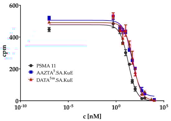 The PSMA binding affinity of DATA5m.SA.KuE and AAZTA5.SA.KuE, as well as PSMA-11, was determined in a competitive radioligand assay using PSMA-positive LNCaP cells that were incubated with 0.75 nM [68Ga]Ga-PSMA-10 in the presence of 12 increasing concentrations of the non-labeled SA-conjugated compounds. The measured radioactivity values were plotted against the concentrations of the SA conjugates (Figure 7). IC50 values were determined using GraphPad Prism 9 (Table 1). AAZTA5.SA.KuE and DATA5m.SA.KuE showed similar binding affinities while PSMA-11 seems to have two-fold higher affinity in vitro.