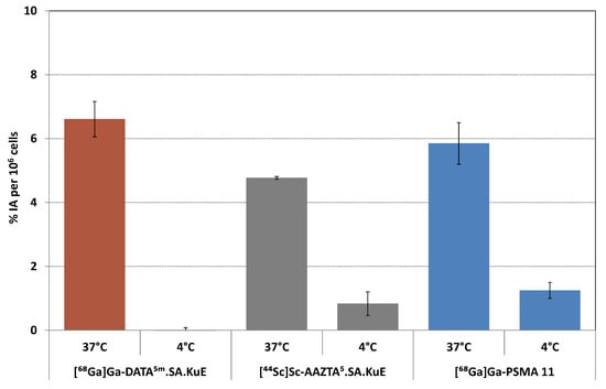 PSMA ligands are internalized upon binding to PSMA, probably via clathrin-mediated endocytosis [33,34]. To determine the PSMA-specific cellular uptake of the developed PSMA ligands, we measured both the surface-bound and internalized radioactivity in PSMA-positive LNCaP cells at four different conditions; at 37 °C with and without blocking with the potent PSMA inhibitor PMPA (2-Phosphonomethyl pentanedioic acid) [35,36,37], and at 4 °C with and without blocking with PMPA. Results are plotted in Figure 8. [68Ga]Ga-DATA5m.SA.KuE displayed the highest internalization ratio 6.6 ± 0.6%, whereas the uptake fractions of [44Sc]Sc-AAZTA5.SA.KuE and [68Ga]Ga-PSMA-11 were slightly lower (4.8% and 5.2%, respectively). PSMA-specific uptake was mainly reduced at 4 °C.