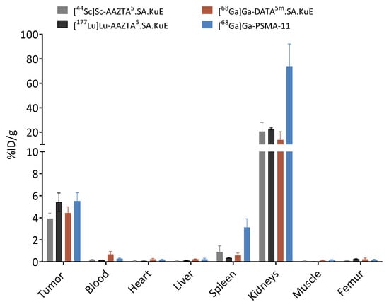 Biodistribution studies. The number of animals used in this study was: [68Ga]Ga-DATA5m.SA.KuE n = 5; [44Sc]Sc-AAZTA5.SA.KuE n = 2; [177Lu]Lu-AAZTA5.SA.KuE n = 2; [68Ga]Ga-PSMA-11 n = 2; [44Sc]Sc-AAZTA5.SA.KuE + PMPA n = 1. Animals were sacrificed 1 h p.i. Organs of interest were collected and weighed. The radioactivity was measured and calculated as a decay-corrected percentage of the injected dose per gram of tissue mass %ID/g.