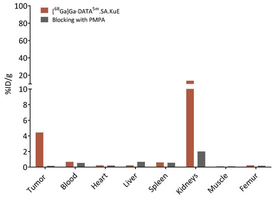 Ex vivo biodistribution of [68Ga]Ga-DATA5m.SA.KuE compared to organ accumulation after co-injection with an access PMPA.