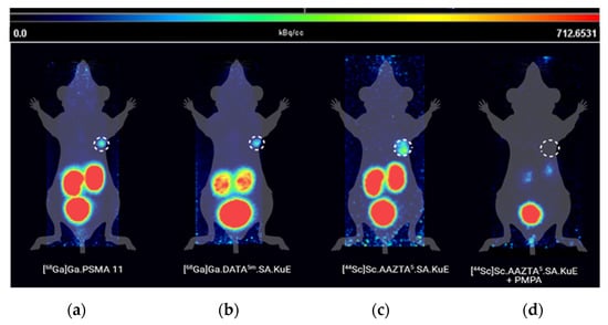 In order to evaluate the in vivo behavior of the SA.KuE conjugates, an LNCaP-xenograft model was used. Labeling of AAZTA5.SA.KuE with the different nuclides scandium-44 and lutetium-177 seemed to have no impact on the pharmacokinetic properties of the conjugates, since there were no significant differences observed in the biodistribution data (Figure 9). Tumor accumulation values of all four compounds were similar, 3.92 ± 0.50% ID/g, 5.41 ± 0.83% ID/g, 4.43 ± 0.56% ID/g and 5.52 ± 0.75% ID/g for [44Sc]Sc-AAZTA5.SA.KuE, [177Lu]Lu-AAZTA5.SA.KuE, [68Ga]Ga-DATA5m.SA.KuE and [68Ga]Ga-PSMA-11 respectively. The higher kidney uptake of [68Ga]Ga-PSMA-11 (73.39 ± 18.77% ID/g) is noteworthy compared to the uptake of the SA.KuE conjugates (20.69 ± 7.24% ID/g, 22.70 ± 0.90% ID/g, 13.63 ± 6.81% ID/g for [44Sc]Sc-AAZTA5m.SA.KuE, [177Lu]Lu-AAZTA5m.SA.KuE and [68Ga]Ga-DATA5.SA.KuE respectively). Both tumor and kidney uptake of [68Ga]Ga-DATA5.SA.KuE were found to be PSMA-specific, since they could be blocked by co-injection of PMPA as seen in Figure 10.