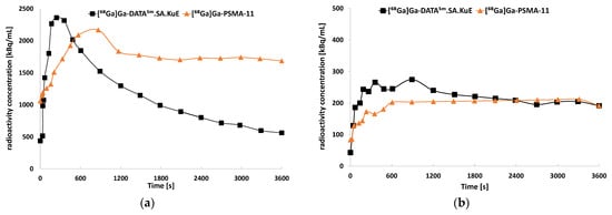 Time–activity curves of the uptake of [68Ga]Ga-DATA5m.SA.KuE and [68Ga]Ga-PSMA-11 in the kidneys (a) and the tumor (b) over the total period of the µPET scan.