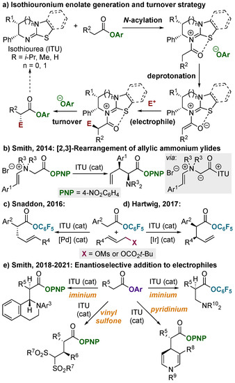 - McLaughlin, C.; Smith, A.D. Generation and Reactivity of C (1)-Ammonium Enolates by Using Isothiourea Catalysis. Chem. Eur. J. 2021, 27, 1533–1555. [Google Scholar] [CrossRef] [PubMed]