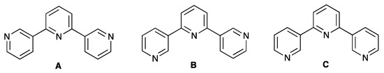 - Housecroft, C.E.; Constable, E.C. The Terpyridine Isomer Game: From Chelate to Coordination Network Building Block. Chem. Commun. 2020, 56, 10786–10794. [Google Scholar] [CrossRef]