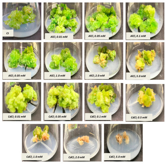 Morphological characteristics of calli incubated for 35 days under different concentrations of aluminum chloride (AlCl3) and cadmium chloride CdCl2 (color, texture, and morphology).