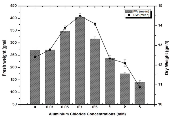 Aluminum chloride-elicited biomass accumulation (fresh and dry weight) in callus culture of F. indica under seven different concentrations along with control. All the values are mean ± SE.