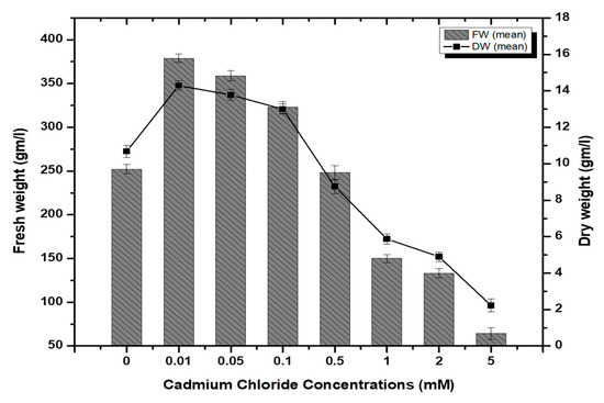 Cadmium chloride-elicited biomass accumulation (fresh and dry weight) in callus culture of F. indica under seven different concentrations along with control. All the values are mean ± SE.