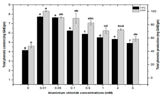 Total phenolic contents and phenolic production of F. indica calli elicited with seven different concentrations of aluminum chloride and control. All the values are mean ± SE. Bars labeled with different letters (LSD values) exhibit significant variation (α < 0.05).
