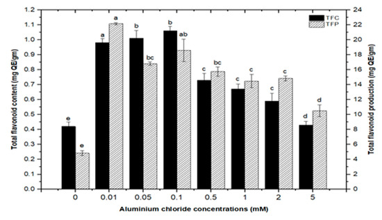 High doses of elicitor have been shown to cause hypersensitivity and cell death, whereas a moderate level was required for optimal secondary metabolite induction [36,37]. Inorganic salts/chemicals such as AgNO3, CdCl2, AlCl3, and HgCl2 have been employed widely in various plant species to trigger and increase the production of bioactive molecules by altering secondary metabolism [27]. Callus cultures of F. indica elicited with different concentrations of AlCl3 and CdCl2 showed a varying effect on total phenolics accumulation. Cultures added with AlCl3 showed a maximum elicitation of total phenolic content (TPC) (7.74 mg/g DW) and (7.64 mg/g DW) at 0.01 and 0.05 mM of AlCl3, respectively, as compared with the control (4.159 mg/g DW) (Figure 4). Maximum levels for total flavonoid content (TFC) (1.069 mg/g DW), (1.014 mg/g DW), and (0.998 mg/g DW) were recorded at 0.1, 0.05, and 0.01 mM of AlCl3, respectively, while a further increase in AlCl3 resulted in a decrease in flavonoid productions as compared with the control (0.4225 mg/g DW) (Figure 5). Furthermore, for cultures elicited with AlCl3, maximum values for total flavonoid production (22.11 mg/L) and (18.6 mg/L) were observed at 0.01 and 0.1 mM of AlCl3, respectively (Figure 5). In a similar study on root cultures of Gloriosa superba, AlCl3 greatly enhanced the phenolic and flavonoid content, as well as the production of colchicine [35]. An increase in reserpine content in response to low doses of AlCl3 has also been reported [28].
