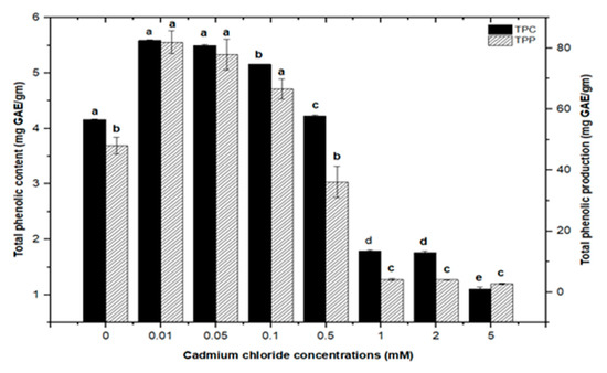 Total phenolic contents and phenolic production of F. indica calli elicited with seven different concentrations of cadmium chloride and control. All the values are mean ± SE. Bars labeled with different letters (LSD values) exhibit significant variation (α < 0.05).
